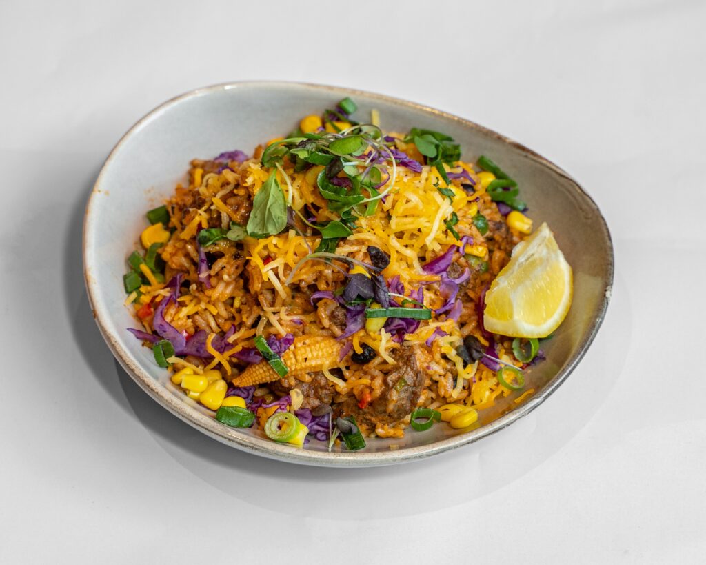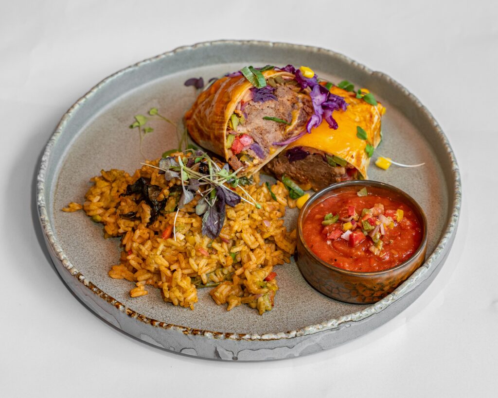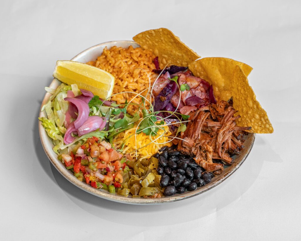 With roasted cabbage, pickled onions, pico de gallo, mexican cheese mix, black beans, mexican rice