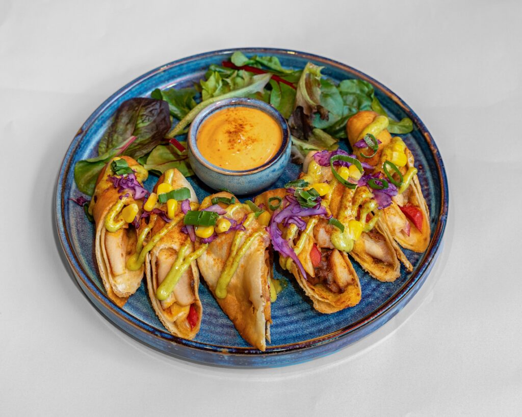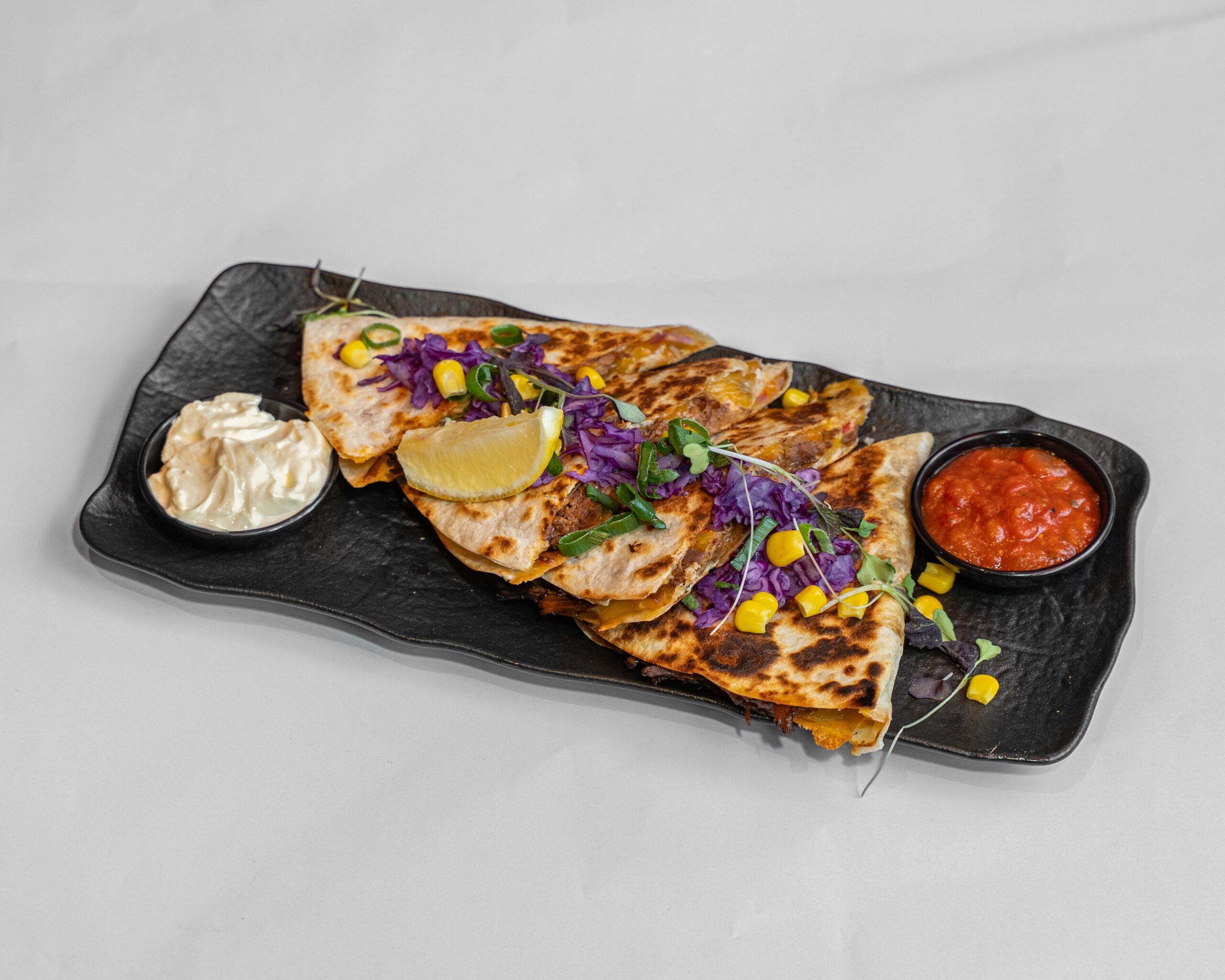 With slow-cooked lamb shoulder, crispy melted cheese, roasted peaches, pickled onions, roquette, pico de gallo, smoked sour cream, salsa verde in a grilled flour tortilla
