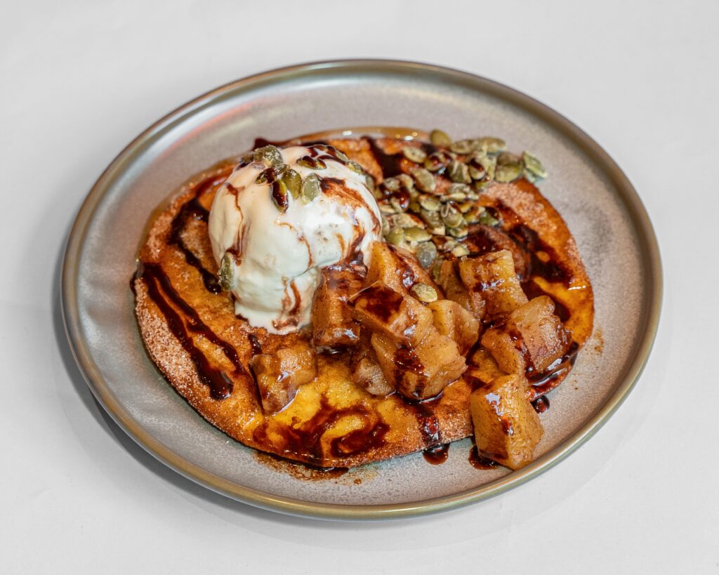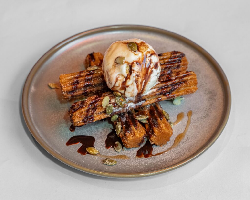 Crispy fried churros with vanilla ice cream & caramelized spicy pepitas