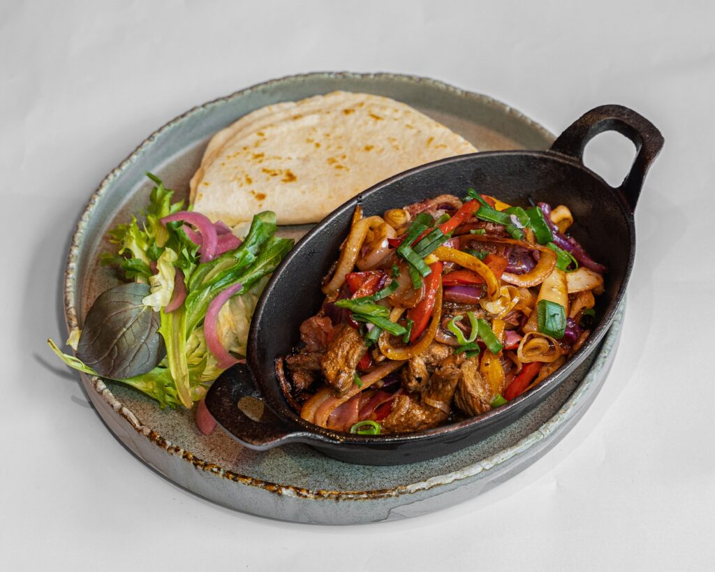 Grilled meat or vegetables with sauteed onions, cabbage, peppers, and flour tortillas