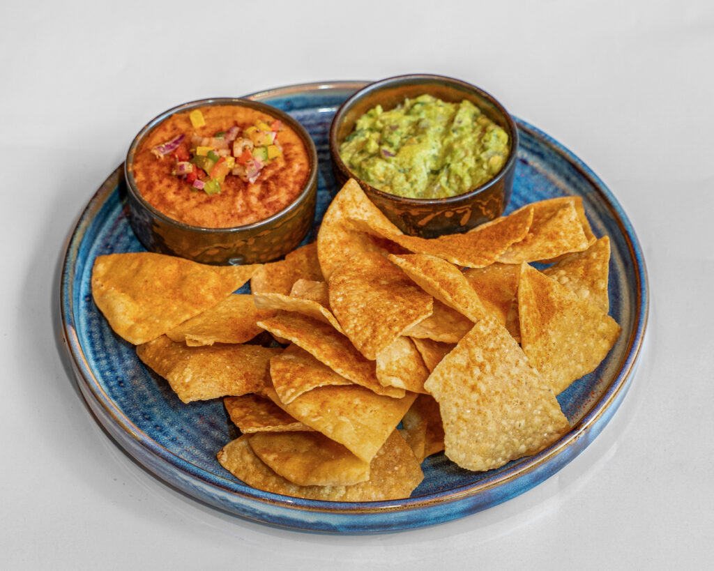 Tortilla Chips, homemade refried frijoles con queso & Guacamole