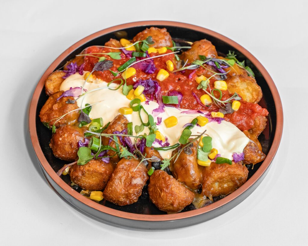 Crispy fries topped with black beans, smoked cheese blend, sour cream & salsa