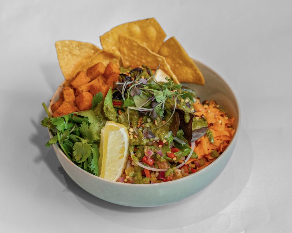 Black beans, picked vegetable, roasted cauliflower, quinoa, corn crisp, salad mix with Mexican herbs & lime dressing